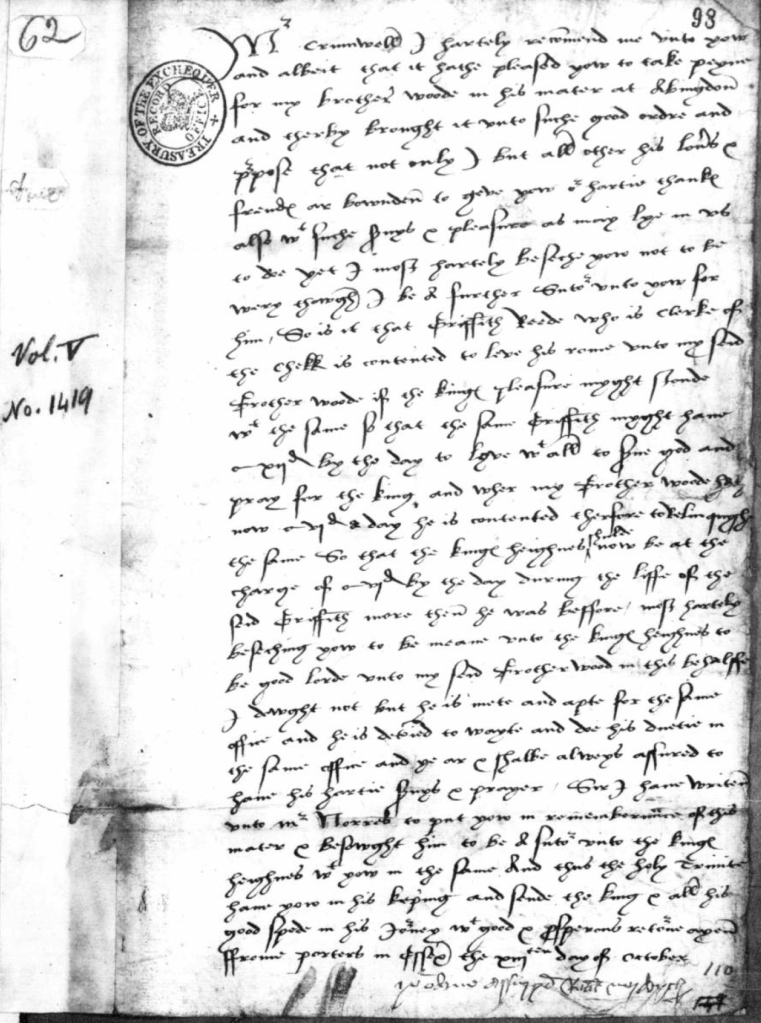 Following this reference to settling Woode’s problems is a further favour that Norwych asks of Cromwell: can you arrange (i.e. talk to the king) to give Woode a position that has just come open in the Exchequer? Assuming that Brother Woode with the matter at Abingdon is the same as the Woode accused of killing Mable and fleeing to sanctuary, this suggests that by the fall of 1532 (about six months after the event), Woode was out of the woods regarding the felony indictment due to Cromwell’s “pains.”