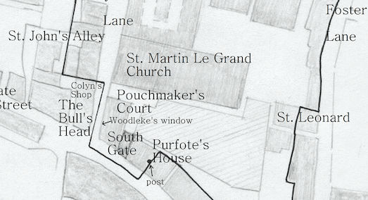 In a 1530s royal enquiry regarding the bounds of St Martin le Grand, Purfote’s former apprentice, grocer William Mathew, testified that in the 1480s Purfote had opened a grocery shop in a property inside, but right on the boundary of the sanctuary precinct. Though he couldn’t leave the precinct for fear of arrest, his customers could come to him and he was safe from being imprisoned for debt and having his goods in the precinct seized by creditors. His shop door opened into St Martin’s, but he also cut a window out to the street outside the precinct where he could sell his goods without leaving his shop.