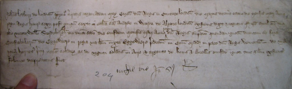 The record documents Ledbury’s confession but indicates nothing about his abjuring, so possibly he was trying instead to “turn approver” (crown witness) on Scardeburgh. Ledbury’s accomplice may be the same William Scarburgh who in 1416 had abjured for a homicide near Ware, but (if it was indeed him) he was obviously still in the realm and back to his criminal ways.