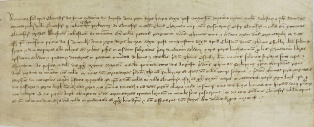 On 11 August 1429, Thomas Pykeryng, a chapman of Gloucester, was in prison in Gloucester castle awaiting trial when he managed to escape, running to sanctuary in the nearby parish church of Holy Trinity. There he confessed to the Gloucester coroners that he had burglarized one Thomas Osteller’s house in 1427.