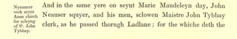 Let’s start with the 1414 sanctuary-taking: John Ninezergh, esq., of Westmorland, took sanctuary in the church of St. Anne Aldersgate in London on 22 July of that year. He confessed to the coroner that he had killed William Gerard at Burton, Westmorland, the previous March.